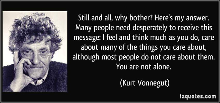 "Still and all, why bother? Here's my answer. Many people need desperately to receive this message: I feel and think much as you do, care about many of the things you care about, although most people do not care about them. You are not alone."
