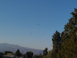 Five US Forest Service planes and helicopters flew over my home to dump water and fire retardant on the blaze. Planes flew in a line to the Columbia River to scoop more water. Zoomed to the fire again. It was like watching ballet.