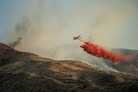 The fire burned 220 acres and is still an active situation, according to the Wenatchee World newspaper. Three hundred homes are threatened. The splendid photo of a plane dropping red fire retardant is by Don Seabrook, Wenatchee World photographer.