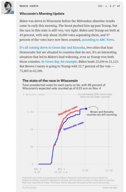 These are meaningful data points. To think that what some TV pundits projected on election night somehow carries more weight than points 1 -5 above is just brain-dead stupidity, or willful ignorance, or a deeply cynical attempt to obtain by force what could not be gotten in a free and fair democratic process. Or it could be some combination of these. It sure ain't an fair and honest take on the 2020 election.