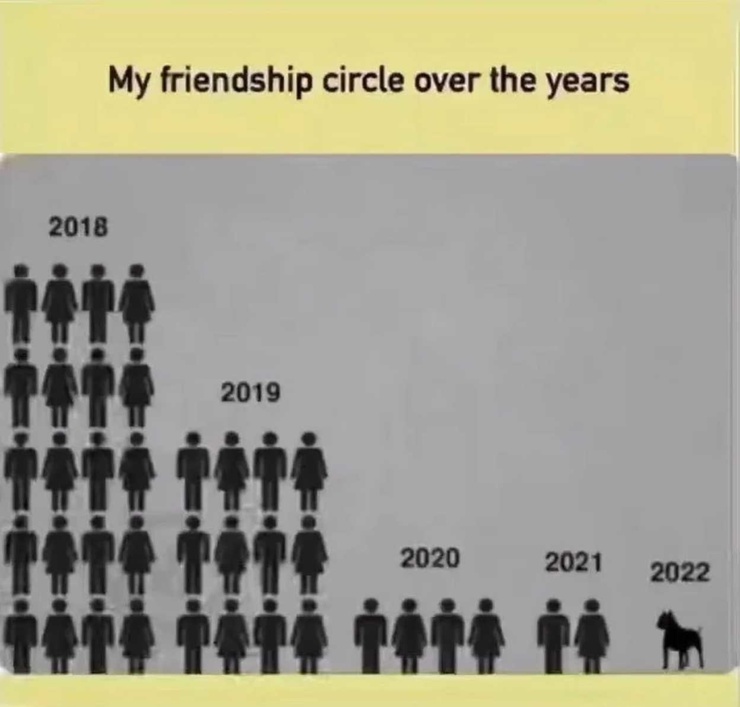 Quite similar to mine. I retired in 2019, after which human friends dropped precipitously. However, I had 2 CATS in 2019, three in 2020, four in 2021 and 7 in 2022! So, it can get better! πŸ˜‰