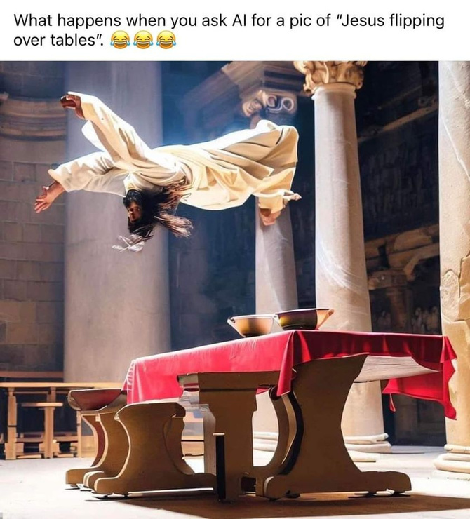 This is on the humorous side but I saw an AI generated meme that was supposed to be Jesus flipping tables. True to form there was a pic of what we think Jesus looks like and he was flipping over tables.