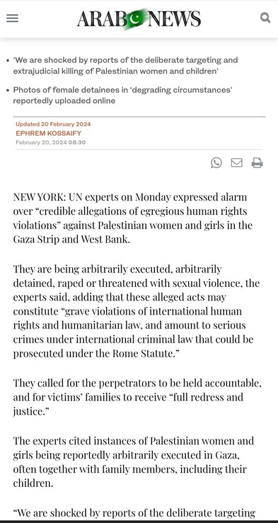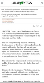 "NEW YORK: UN experts on Monday expressed alarm over “credible allegations of egregious human rights violations” against Palestinian women and girls in the Gaza Strip and West Bank.