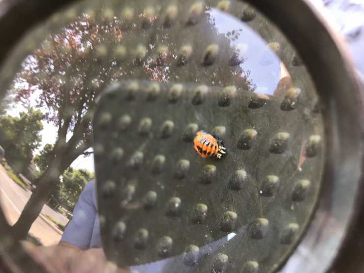 Seen this morning opening up Surplus Gizmos in Portland - it looks like she has 2 pr legs in back & 2 pr by her mouth! Didn’t have time to get better pix. Only superficially looks like ladybug...