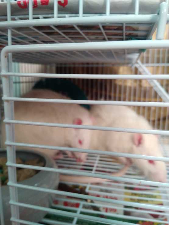 Seems everyone in the county knows that we take odd rescues! Today 2 large, cuddly white rats! Good grief. More mouths to feed. Cute though.