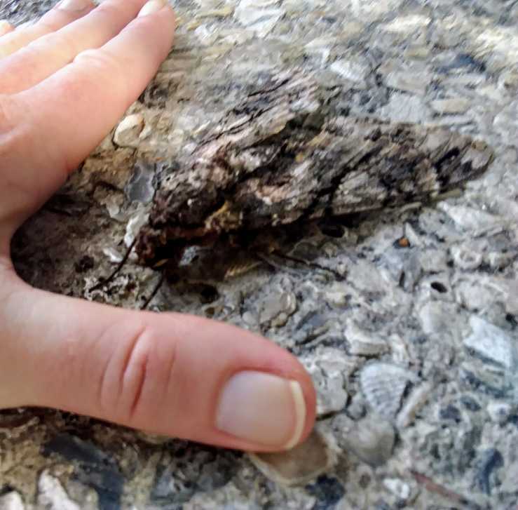 I apologize for the quality of these. This moth was so large (4 in. long or so)I mistook it for a sparrow at first. Despite its size it blended remarkably well with the pavement. I had to toggle the colour balance to get it visible in the pics.