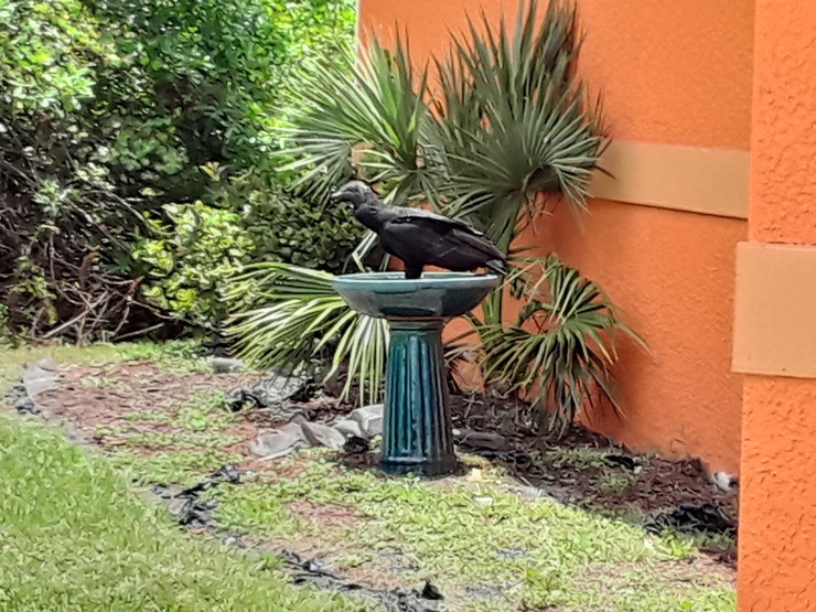 Florida's State Bird- The Turkey Vulture__ Came home after feeling grumpy all day and found a flock of vultures hanging around my bird-bath!! Instantly put a smile on my face. They've gotta beat the heat too. The others flew off when I got out ...