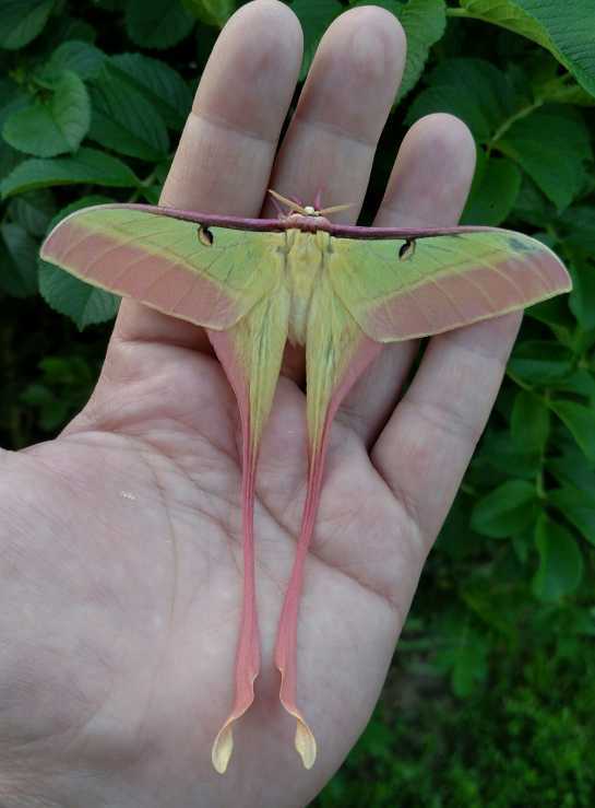 My first male Actias dubernardi, from the latest group of caterpillars, to eclose. He's so handsome! I'm thinking of trying to pair him with a female Actias luna for some hybrids. It's been known to work, though not commonly. The last pic is the ...