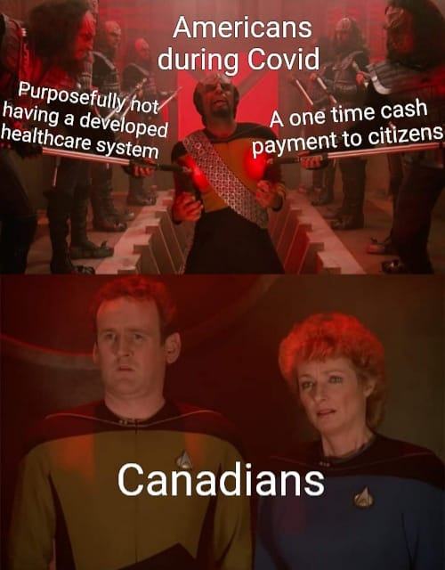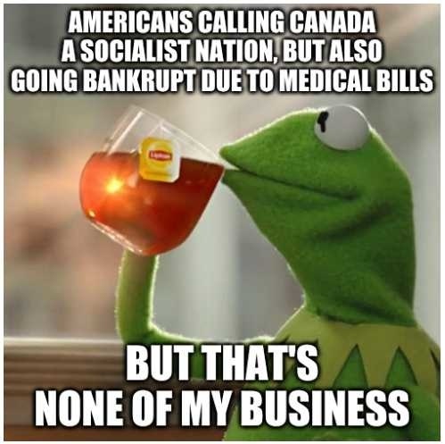 Amerikaans gets so worked up about their copays and coverage limits but then you mention universal health care and they just come unglued about how horrible things are for Canadians. Yep, that's us.