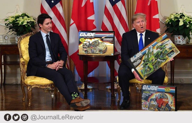 Trump is warning Trudeau that he should be buying more toys from Lockheed Martin, Boeing, Raytheon and Northrop Grumman if he still wants to with him in NATO. (Nice socks Justin!)