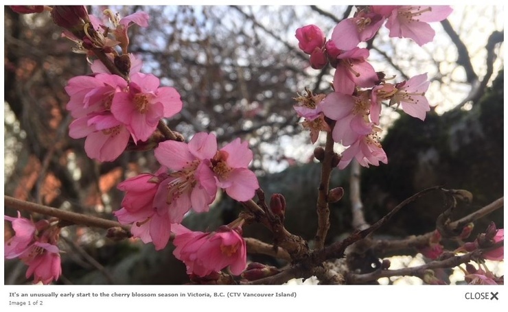 Not so as to gloat or anything like that.... Victoria's cherry blossoms bloom while most of Canada freezes