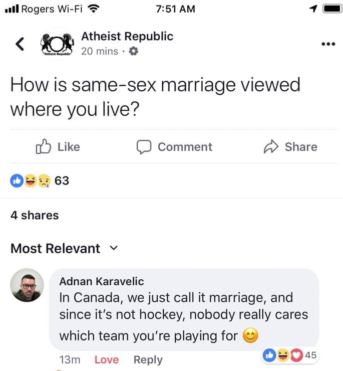 The Canadian position on same sex marriage summed up perfectly, just watch where you're putting that stick unless you have permission. ;)