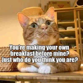 @FrayedBear No, just an old habit. I grew up in farm country, and the livestock always gets fed first. Are you so selfish that you eat before you feed the cat?