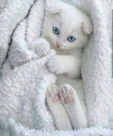 Those blue eyes and pink feet against the snowy white background are visually stunning.