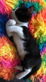 What is it laying on? A gay pride shag? For some strange reason, having just woken from a doze in front of Saturday night tv I couldn't see the cat just the colours.