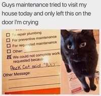 @Hathacat can you just imagine what kind of BS story that guy came up with as to why he didn’t complete the work order? I bet that 10 lb pussycat turned into a rabid pit bull. ?