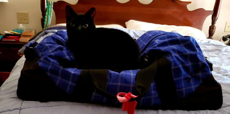Linda packed three wardrobe changes and stage makeup for her singing group's latest show. Malbec thinks he'd be a good prop.