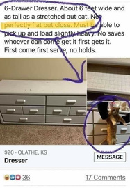 Ha! That happens to be one of my pet peeves--posting furniture for sale (or for free) without the product dimensions! Cute cat though.