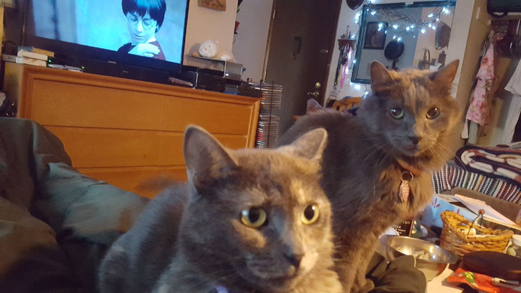 Hey everyone! I'm new here and came across this group, so I thought I would share a picture of my fur babies :) the ginger fella is Oliver and the black kitty is Fiona. They're spoiled absolutely rotten.