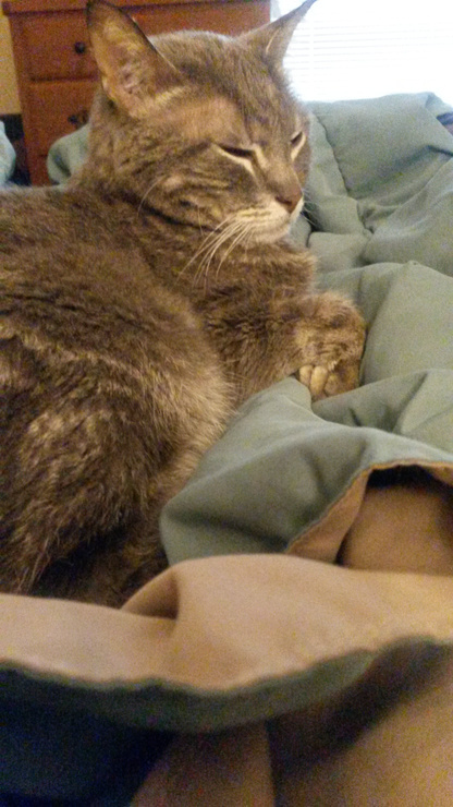 Mr. Nugget is no more, and I am so very sad. He was such a snuggly kitty, and so friendly with everyone. He enjoyed taking walks with me and Abbey the Lab. I miss him so.