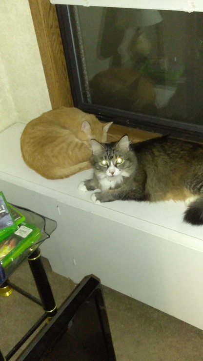 Here are my two handsome boys. Axel is a Maine Coon and Rebel (whose name is his personality) is an Orange Tabby.