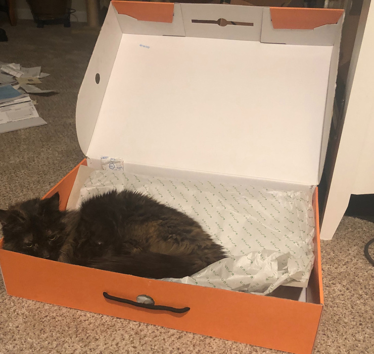 My almost 17 year old cat was sort of lethargic and hiding away until I put out this boot box. She sleeps, sits and rolls in it and tears the tissue paper. It’s like a fountain of youth!