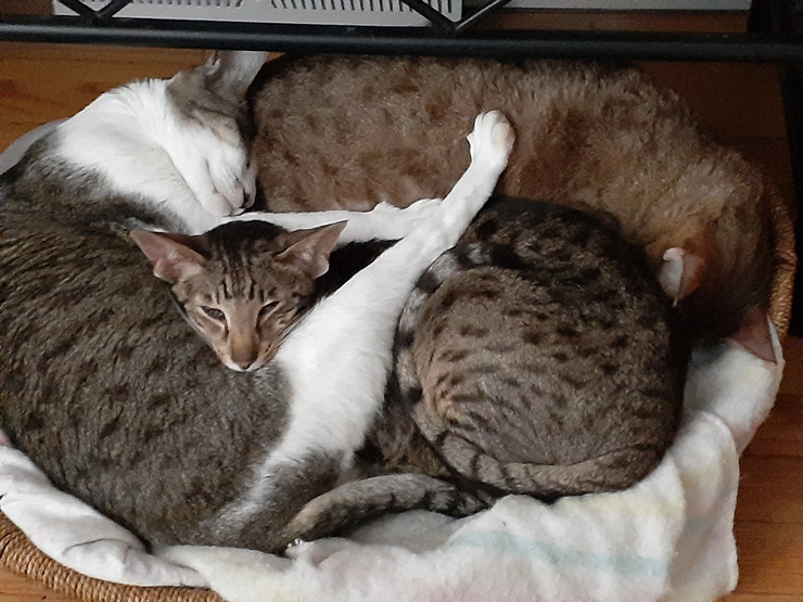 This is my gang, L to R: Einstein (Steiner), Cookie, Monkey and Pixie. In the second pic is Obie, who is no longer staying with me. The cats enjoyed him while he was here.