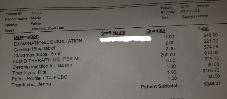 I was looking at Mazie's vet bill earlier. Apparently I got thank yous from Rita and Jenna free of charge. So generous!