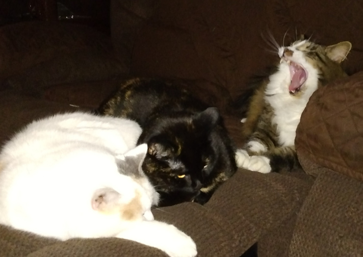 That's Nala napping, Pixie contemplating, & Leo showing off his yawning ability.
