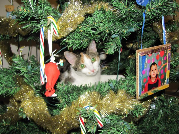 This is from 2012...my calico's first xmas. It was her favorite place to be for that month. The next year, she was full grown and the branches didn't support her. Bye bye tree. That was 5 trees ago.