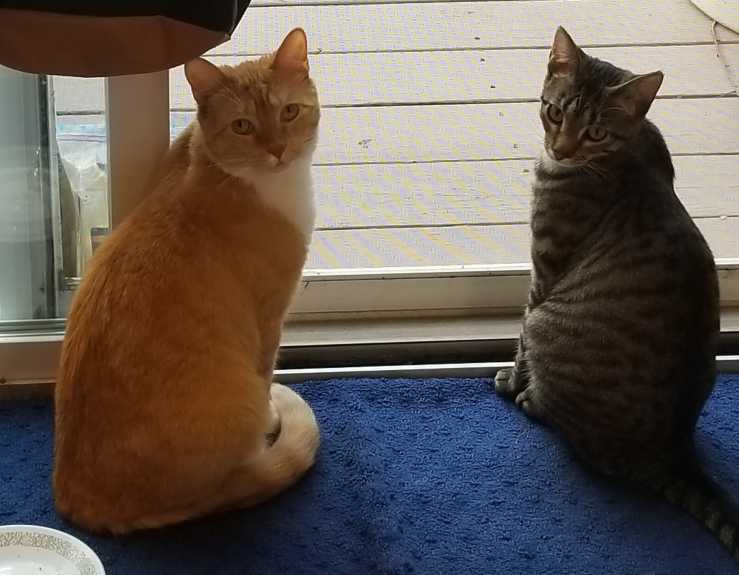 My girls! We're making progress, nobody's fur is ruffled. The deck door is open, the screen is closed and they were enjoying the smells and view til I distracted them for a picture.