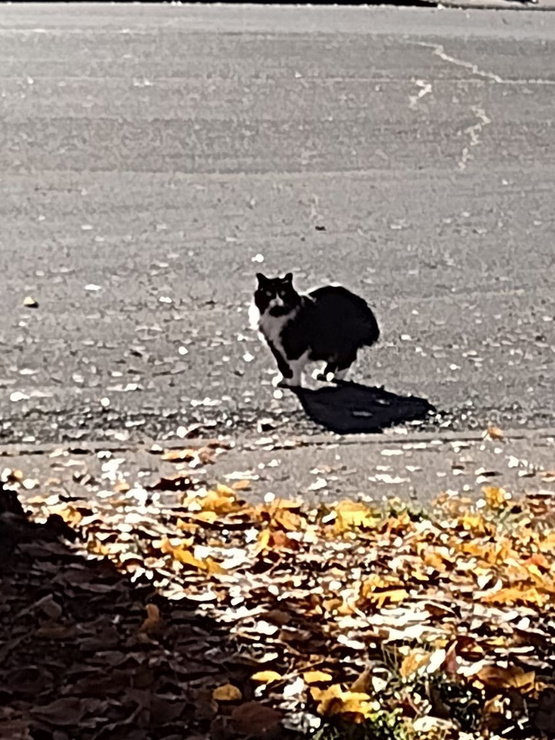 My sister took a Fall photo of Iris, our long haired tuxedo cat.