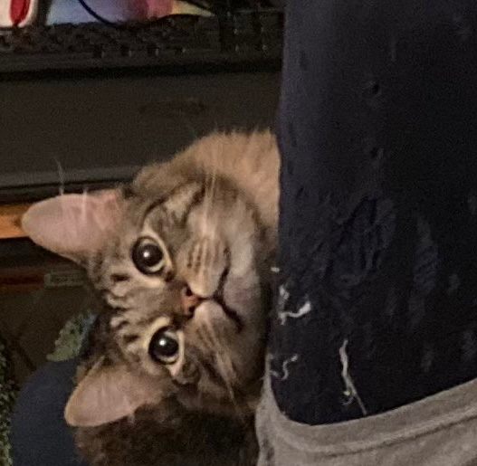 Mazi giving me that “you still up mom?” look while he peeks at me from the chair he loves to shred…