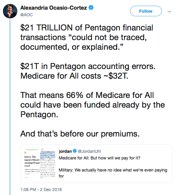 See, I would have thought this would be a good argument. The Misleading Claim That $21 Trillion in Misspent Pentagon Funds Could Pay for ‘Medicare for All’ Representative-elect Alexandria Ocasio-Cortez, the rising liberal ...