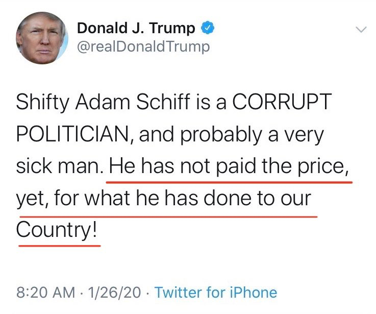 Trump Tweets Schiff Has Not Yet Paid the Price for His Actions President Trump continued to ratchet up his rhetoric against Rep. Adam Schiff, tweeting out what appeared to be a threat against the House Impeachment Manager by ...