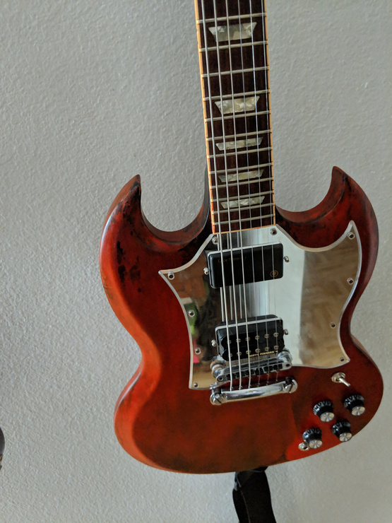 I've never had the scratch to buy a USA built Gibson SG standard. Well, there's nothing standard about this any more. It's beat to hell, and modified to a single dirty fingers humbucker in the bridge, single knob for volume only, but plays and ...