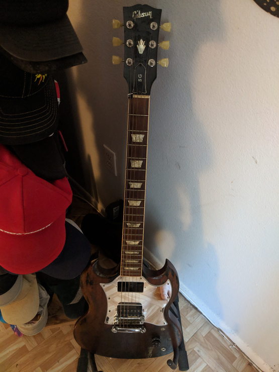 I've never had the scratch to buy a USA built Gibson SG standard. Well, there's nothing standard about this any more. It's beat to hell, and modified to a single dirty fingers humbucker in the bridge, single knob for volume only, but plays and ...