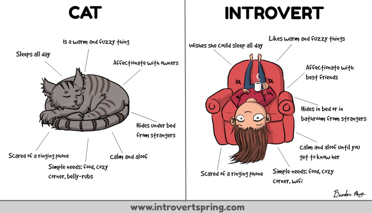 "Have you ever noticed that introverts are like cats? I’ve talked about the similarities before, but I’ve found even more parallels, which are summarized in the below comic, illustrated by my nephew Brandon Chung." Michaela, Introvert ...