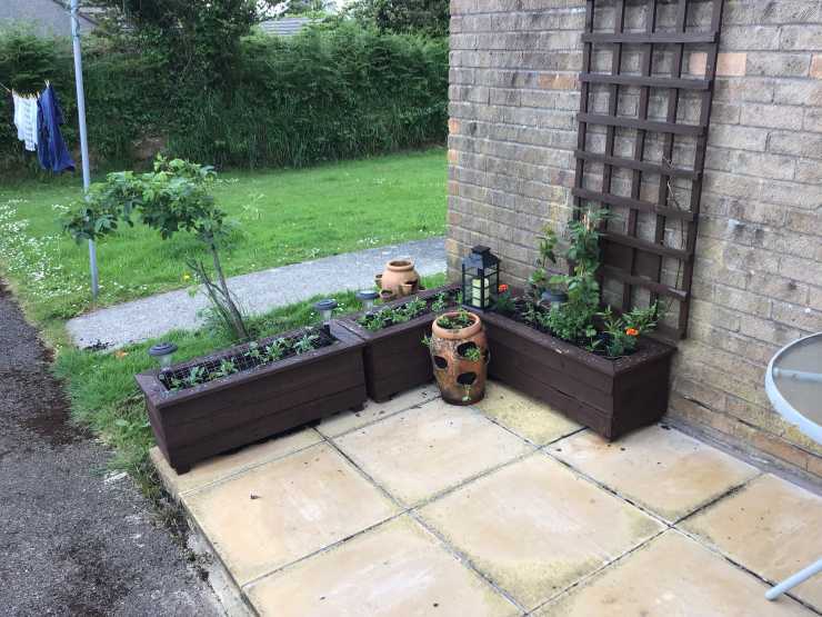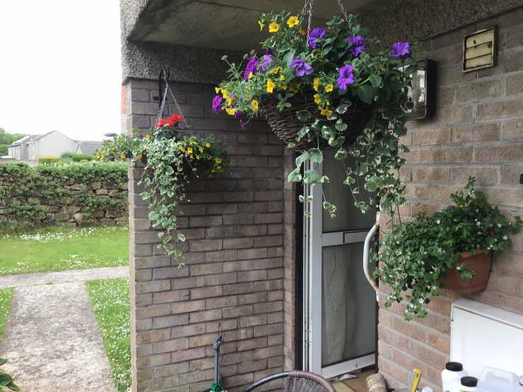 Todays effort at my friend and neighbour,s flat . The paving slabs we put down last year as he is very unsteady on his feet . Plants are Lobelia , geranium , scented stock , marigolds , asters , a wine berry plant and a few clematis
