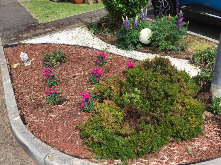 This was today’s effort with a neighbour . It was overgrown , the fuchsia we thought was dead , the bushes I,ve no idea , and the lupins were there already . We planted some dianthus too.
