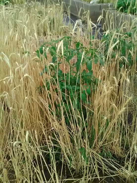 Cherry tomatoes in a polycultural cover crop, two feet tall.