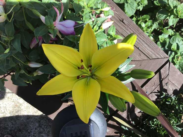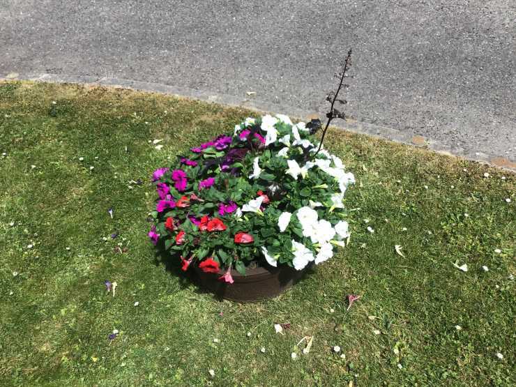 My Petunias in a half barrel have gone loopy . The stem is a heuchera fighting for a bit of light.