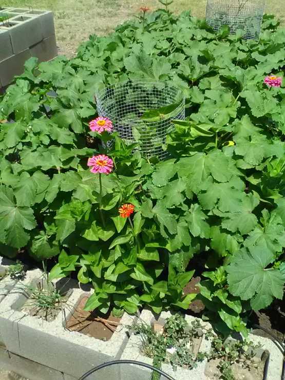 Zinnias blooming in the okra patch! The wire basket is sunk into the raised bed and we add our compost in it.