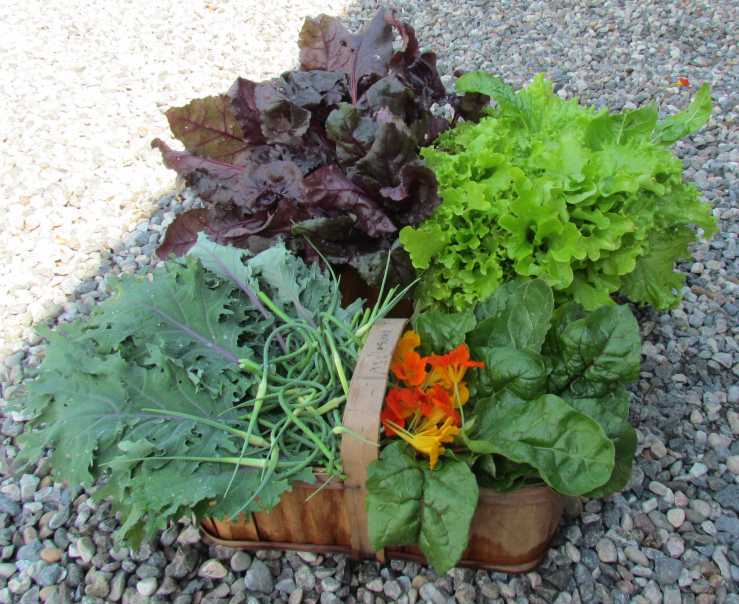 A couple of quart baskets going up to the cottage to feed the family who are up there this weekend for the Canada Day long weekend. Too early in the season for much else beside the baby Bulls Blood Beats, Mesclun Mix Lettuce, Kale, Rainbow Chard, ...