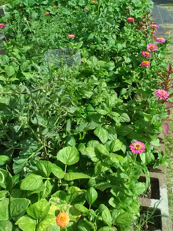 A 48 square footage raised bed with zinnias, marigold, pinto beans, cukes, cotton, potatoes, heirloom tomatoes, beefsteak tomatoes, and a chili pepper plant. And basil. I'm a polycultural gardener ?This is a partial view depicting only half the bed. ...