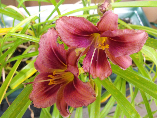 A pair of daylilies ... my favs are the hybrids with an 'eye' ... they're growing in a tub, on my apartment patio