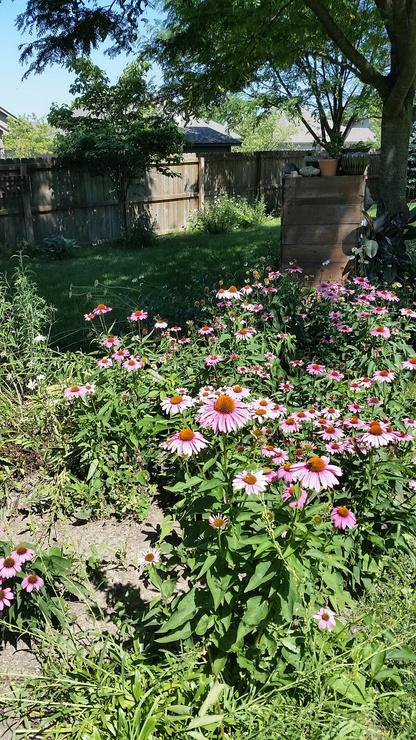 Morning stroll around the backyard. Cone flowers blooming! And, it's supposed to be a hot/sunny afternoon. I might set up a "real" digital camera and see if I can catch some good creatures.