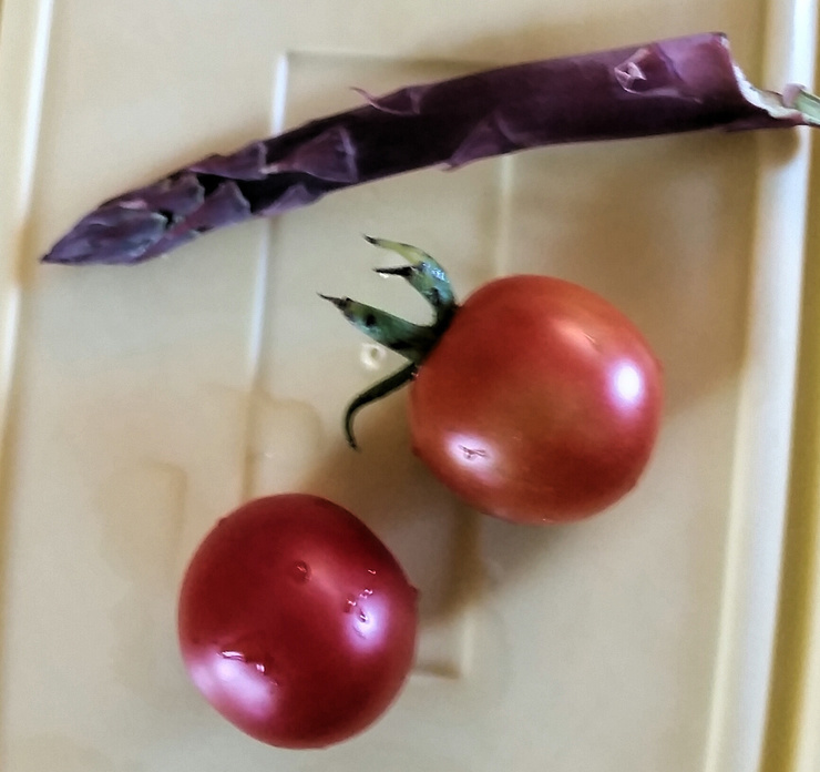 The first and the last. Last asparagus stalk I'm going to pick. (I swear!) First tomatoes..... went immediately into a BLT for lunch!