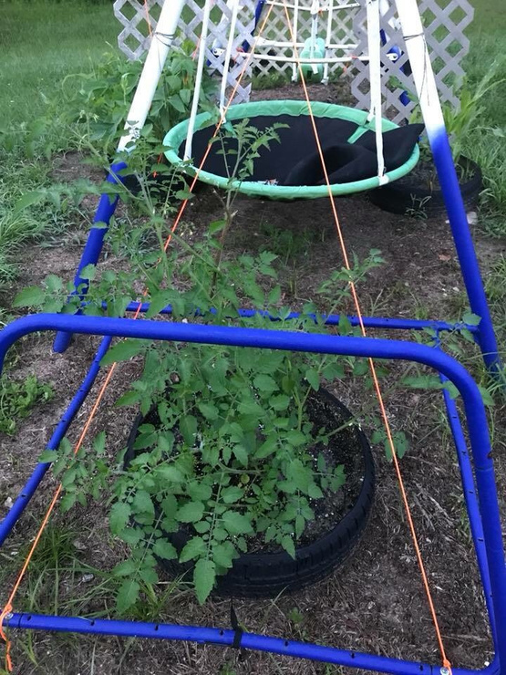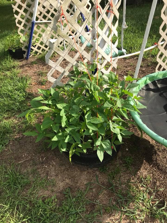 The swing set garden is doing great going to have to add a bigger trellis for the Asian yard long beans the Seminal pumpkins are growing and look at Armenian cucumbers blooming