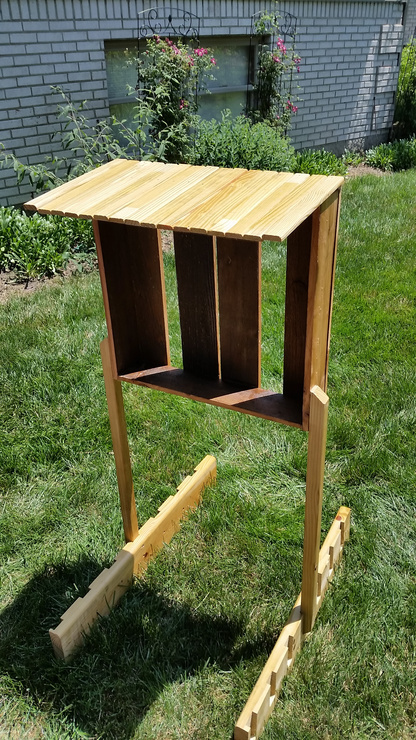 Bee hotel update: Shade roof attached and polyurethaned. Next, fastening in the cedar fence post sections and filler branches..... maybe this evening.....